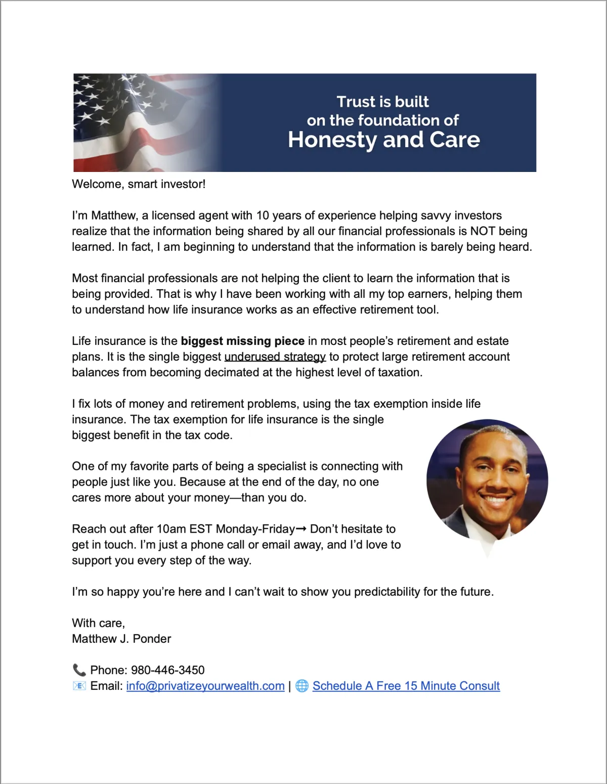 When I really took the time to listen to Matthew at his presentation I had a very good vibe from him. I knew he was going to be the one that I trust to be there for me and my family. I will let others know that I have no doubt. I would recommend to others.